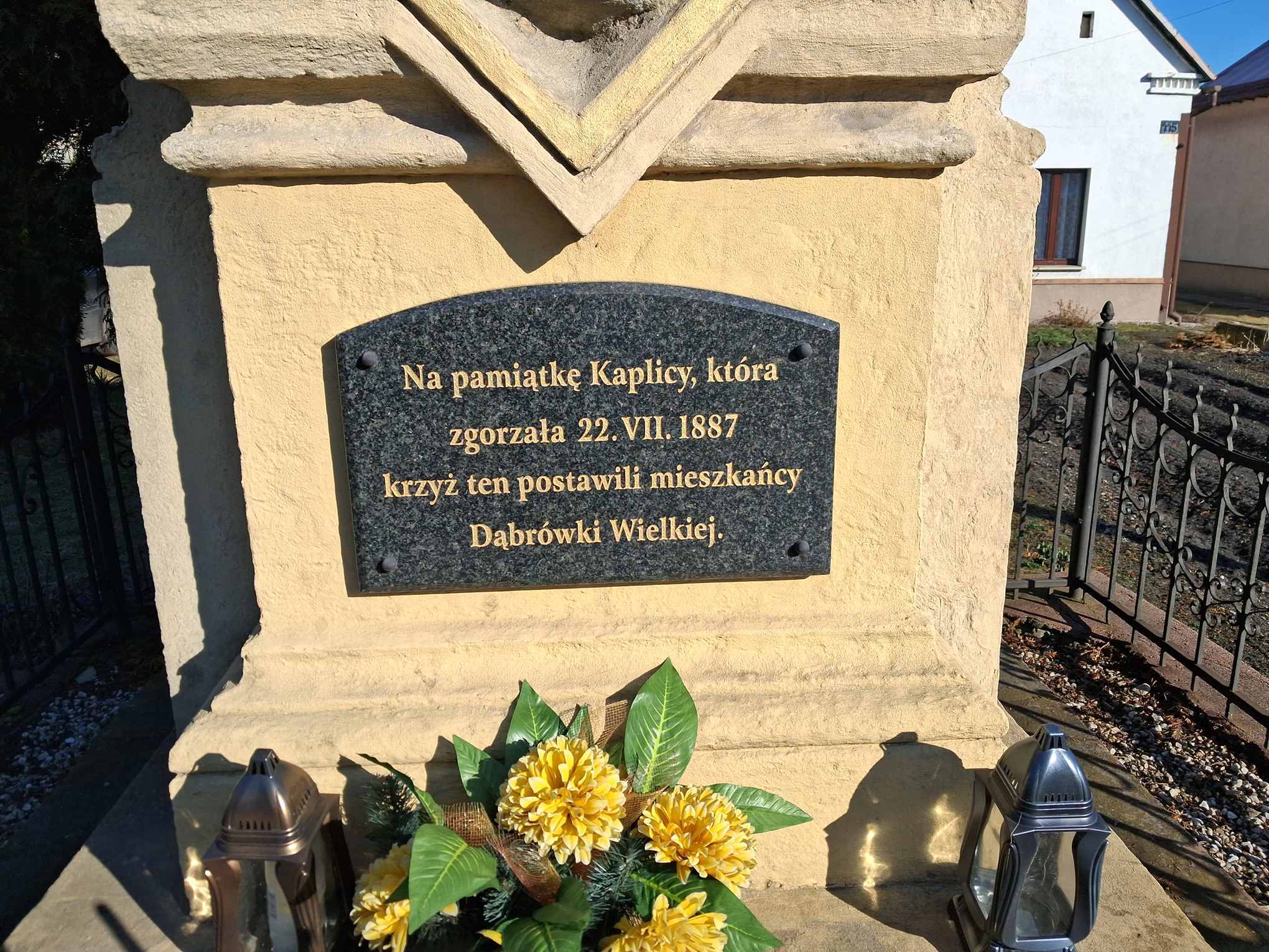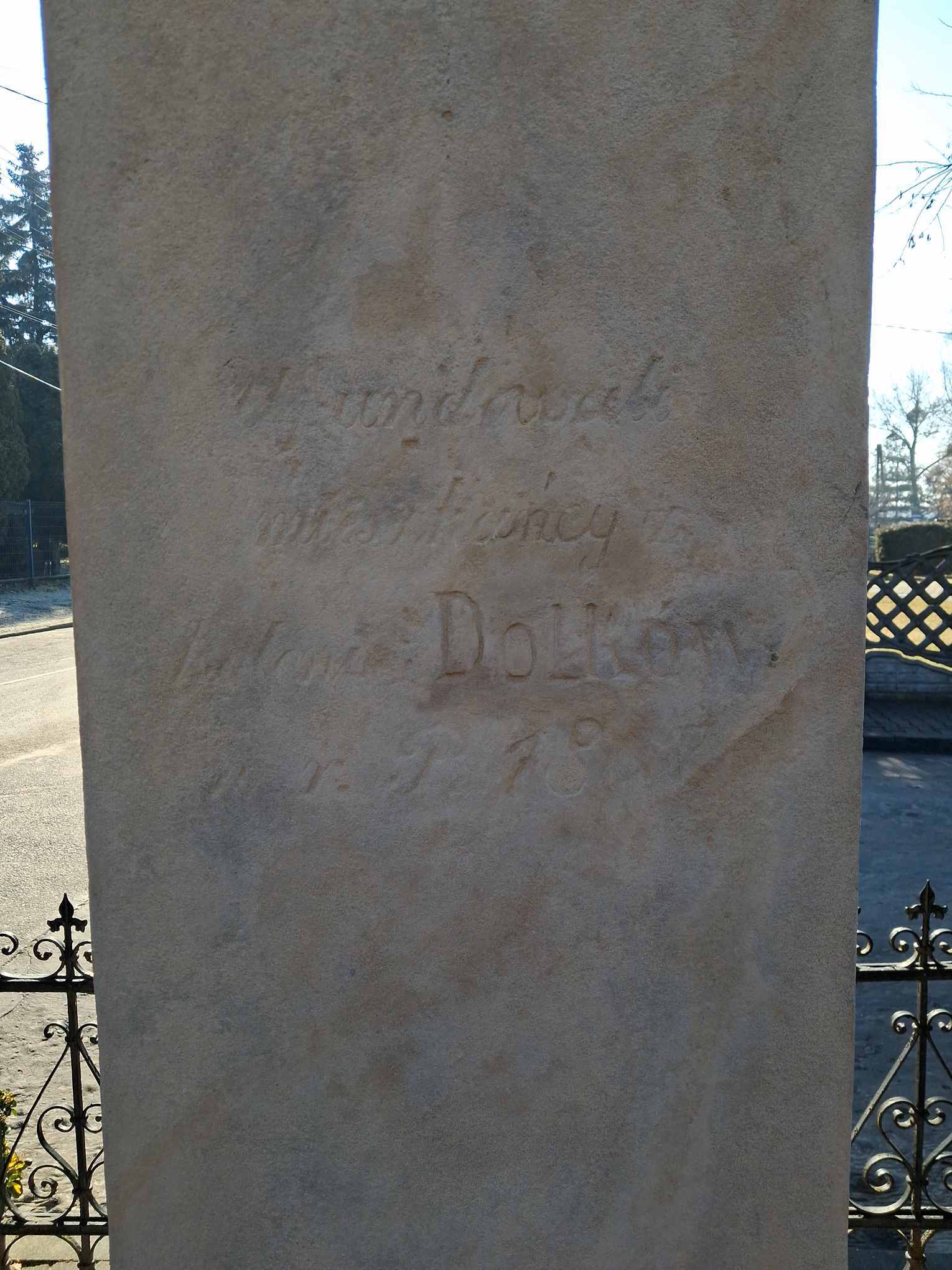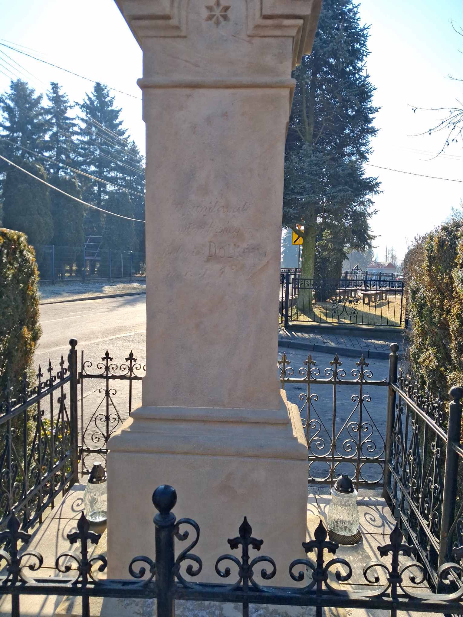 Krzyż został w zeszłym roku (2025) odrestaurowany. Z drugiej strony widoczny napis „Ufundowali mieszkańcy kolonii Dołków w r. P. 18… - tutaj nie wyraźnie pisze ale chyba chodzi o 1867 rok